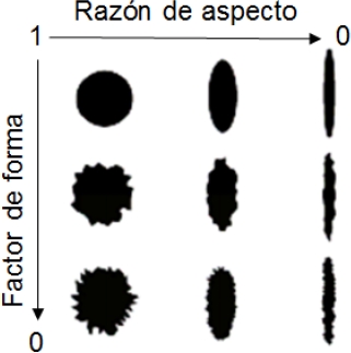 La razón de elongación (ER), ecuación (5), es definida con la razón de la dimensión intermedia (W) de la silueta y la dimensión larga (L). La razón de elongación para objetos circulares es igual a la unidad. Cuanto más alargada la forma, mayor es su factor de elongación (>1) [11]: