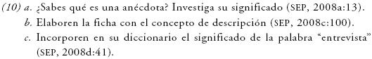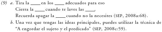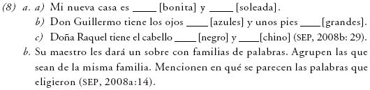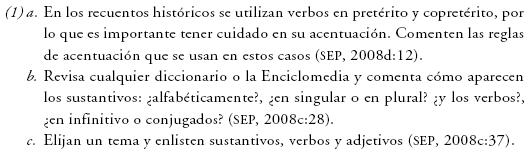 En cuanto a los criterios sintácticos, dado que se asume que los elementos de esta clase son palabras, es posible encontrarlas en oraciones, como en (9); ahí aparecen en función de sujeto o como parte del predicado, pero a partir de las actividades se privilegia la función de sujeto, en tanto que se excluyen otras funciones sintácticas. Aunque en el libro de texto no se maneja información explícita acerca de éstas, aparecen frecuentemente las etiquetas de sujeto y predicado, pero no se proporciona una definición, como en (9b).