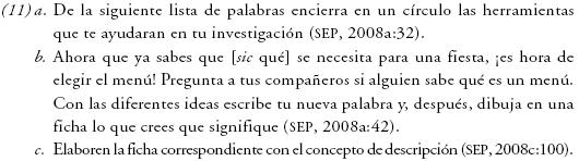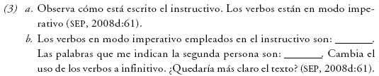 En el libro de texto se privilegian las actividades enfocadas en la lectoescritura y en las técnicas de estudio, más que el desarrollo de un concepto en particular, como en el fragmento 1 [en adelante sólo se referirá, entre paréntesis, el número del fragmento]. No obstante, a este conjunto de actividades subyace todo un entramado de información morfológica en el caso del verbo, pues la información flexiva es la que se aborda con mayor frecuencia, aunque predominantemente de manera implícita y en general, nada clara.