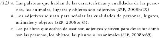 A pesar de que el adjetivo constituye una clase muy amplia, en el libro únicamente se maneja la noción de adjetivo calificativo. No obstante que en un primer momento no aparece esta etiqueta, la definición se restringe a esta subclase, como en (12). Al resaltar que denotan características o cualidades físicas de personas, animales, lugares u objetos, se privilegia una definición léxica de los adjetivos.