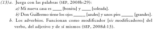 Morfosintácticamente se hace un manejo implícito de las propiedades flexivas de género y número que tienen los adjetivos, así como de la concordancia que de acuerdo con estos rasgos establecen con el núcleo al que modifican. Esto aunque no se hace uso de ese término, como en (13a); en cambio, se explicita la posibilidad que tienen los adjetivos de ser modificados por los adverbios, como en (13b). En tanto que el criterio de adyacencia y posición antepuesta o pospuesta al núcleo que modifican no se explicita.