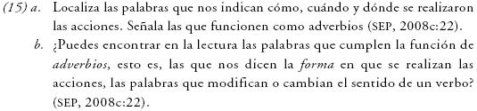 El desarrollo de esta clase privilegia su función, como en (15), pero a partir de la información no se puede diferenciar si función se emplea para denotar el uso y utilidad del elemento léxico o si el texto se refiere a una función gramatical, ya que las palabras que se indican en la instrucción son adverbios y no se menciona a lo largo de la serie la posibilidad que tienen para funcionar como adjuntos o como complementos circunstanciales.