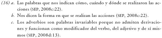 Los adverbios constituyen una clase extensa y heterogénea en forma y funciones, por tanto resulta difícil de definir. Esto se refleja en que no se presenta una definición unificada y completa, pues se introducen diversas aproximaciones a una definición; cada una a partir de distintos niveles de análisis, como en (16).