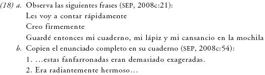 También se afirma que los adverbios se construyen a través de "una sola palabra o un enunciado", lo cual resulta sumamente confuso, pues se trata de definir una clase léxica y, por tanto, una palabra. A este respecto, se emplean indistintamente los términos enunciado, oración y frase, como en (18), para nombrar un mismo referente, aunque de manera paralela se busca introducir el concepto de oración en otras actividades. Así se refuerza la confusión entre describir la clase léxica de adverbio o la función de adjunto o complemento circunstancial.