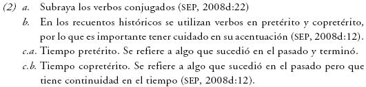 No se emplea la etiqueta flexión, sino conjugación, como en (1b) y (2a); no obstante, bajo esta etiqueta únicamente se hace referencia a la flexión de tiempo, y dentro de este rasgo flexivo sólo se abordan de manera explícita el pretérito y el copretérito, aunque no se especifica que pertenecen al modo indicativo, como en (2b). Para explicar la diferencia entre ambos tiempos gramaticales se hace alusión implícita al rasgo de aspecto sin mencionar las etiquetas perfecto e imperfecto, sino "terminado" para el pretérito, y que "tiene continuidad en el tiempo" para el copretérito, como en (2c). Aserción que resulta poco comprensible, ya que no expresa con precisión el contraste aspectual entre los eventos y no se explicita la relación de este rasgo con la flexión verbal.
