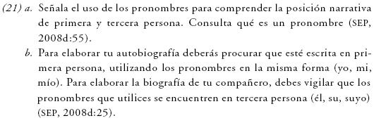 A pesar de las dificultades para describir clases léxicas, se introduce una con funciones estrictamente gramaticales, como es el pronombre. Aunque esto ocurre ya en sexto grado, no se presenta una definición de la clase y en cambio se solicita al alumno que investigue alguna, como en (21a).