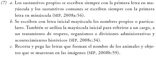 Nótese que, aunque la información se mantiene esencialmente igual a lo largo de la serie, se muestra mayor especificidad conforme avanzan los grados escolares, pero a partir de los datos en ningún momento se caracteriza explícitamente al sustantivo como una unidad léxica con propiedades particulares. En cambio, se asocia el concepto con rasgos extragramaticales, pues las definiciones están basadas en criterios ortográficos, como la identificación a partir del uso de letras mayúsculas y minúsculas. Asimismo se asume que las unidades de esta clase están compuestas por letras, como en (7c), aunque no se especifica que esta característica es pertinente únicamente a nivel gráfico y no es privativa del sustantivo, como tampoco lo es el uso de mayúsculas y minúsculas.