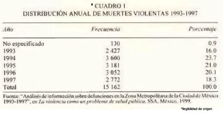 SECRETARÍA de SALUD, 1999, "Análisis de información sobre defunciones en la Zona Metropolitana de la Ciudad de México 1993-1997", en La violencia como un problema de salud pública, SSA, México. [ Links ]