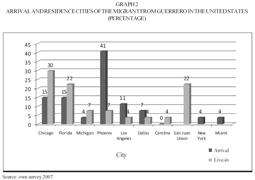 The main destination for San Juan Union in the U.S. is Phoenix, Arizona, however the main city where they live is Chicago (graph 2); other arrival cities are Florida, Michigan, Los Angeles, Dallas and New York. In relation to the cities to live we found: Florida, Michigan, Los Angeles, Dallas and Carolina. Worth mentioning is that 22 percent of the interviewees lives in San Juan Union; all of them are in advanced ages and opined that they are no longer considered to work in the U.S.