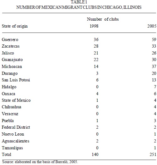 Most of the migrants organized through clubs live in Chicago, Illinois. As a matter of fact, inn 2005, Guerrero held the first place by number of clubs it represents above the states of migratory tradition (table 1).