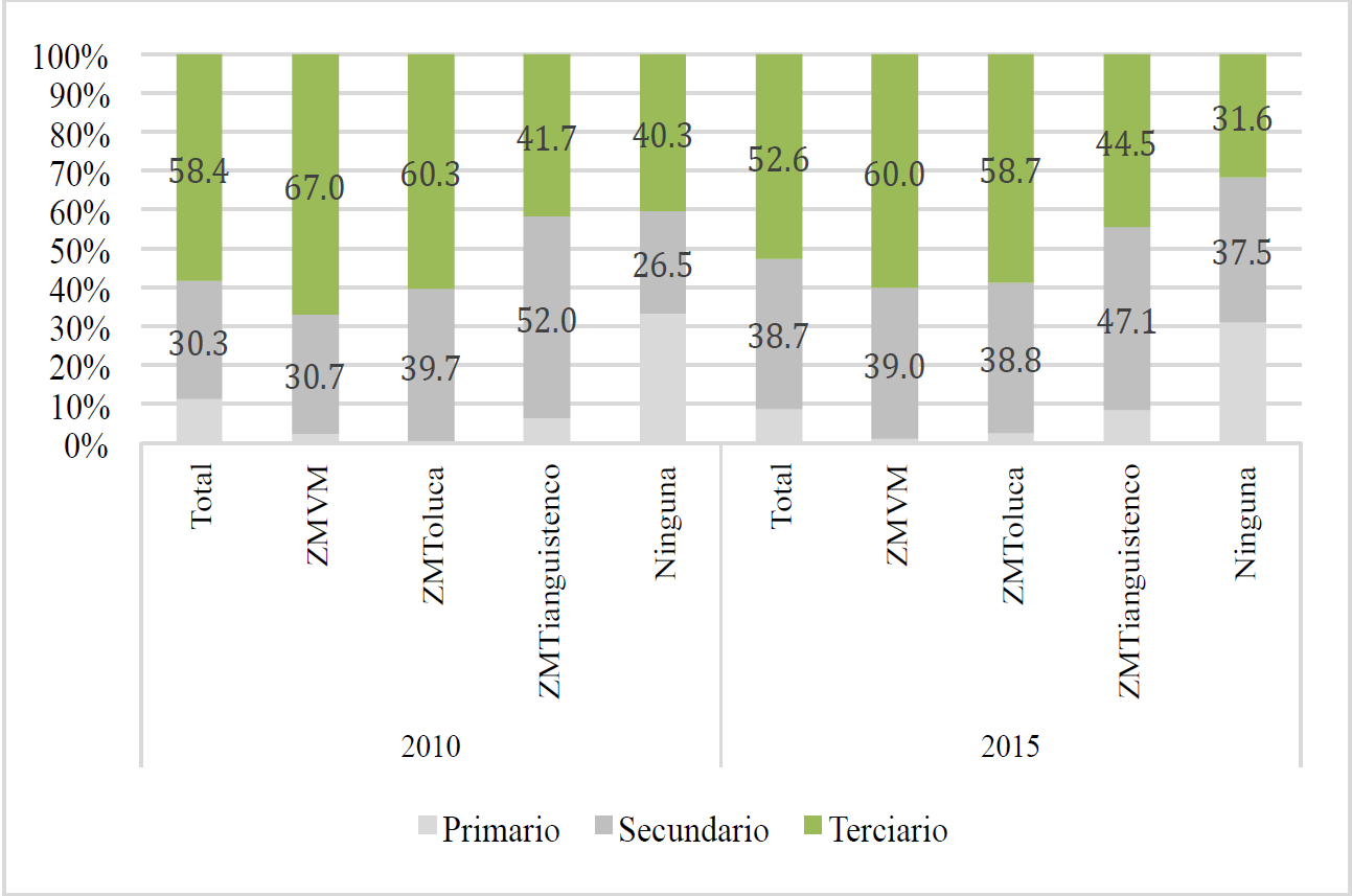 Conforme a dicha Figura, en 2010, de la población en estudio, 72. por ciento es económicamente activa en el conjunto de la entidad; 70.2 por ciento en la ZMVM; 80.4 por ciento en la ZM de Toluca; 77.7 por ciento en la ZM de Tianguistenco; y 74 por ciento en los municipios no metropolitanos. Lo que sugiere que la actividad económica es más dinámica en el conjunto de municipios que componen las zonas metropolitanas más ligadas al centro político-económico de la entidad. En 2015, la población retornada económicamente activa disminuyó a 64.7 en el Estado de México, este comportamiento es replicado en las tres ZM y los municipios no metropolitanos. Esta disminución en la población retornada económicamente podría estar relacionado con el aumento de mujeres retornadas, esto en función que ellas tienen tasas de actividad económica menores a las de los varones.