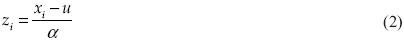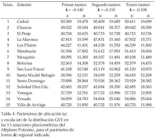 en la cual, u y α corresponden al parámetro de forma regional (k) de la distribución GVE, pero son los relativos a su registro. Entonces, cada vez que se calcula la función GVE de los datos conjuntados se obtiene un nuevo parámetro de forma k regional, el cual no se cambia y requiere un nuevo cálculo de parámetros u y α de cada registro. El proceso se repite hasta que el valor de k no varía de un tanteo a otro. En la tabla 4 se muestran los resultados de los tanteos y en la tabla 2 las predicciones estandarizadas (