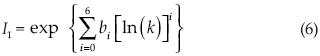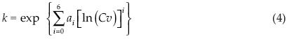 Para la estimación de los parámetros de ajuste (k,α) de la distribución TERC, se ha utilizado el método de las regresiones polinomiales del logaritmo natural del Cv y k, desarrollado por Zorraquino (2004) y aplicado por Nanía y Gómez (2004) y Campos (2008), el cual comienza por evaluar el coeficiente de variación (Cv), como el cociente entre la desviación estándar y la media; con base en tal valor se selecciona uno de los tres intervalos siguientes: 0.190 a 0.30, 0.30 a 0.70 y 0.70 a 0.999. El parámetro de frecuencia se estima con la fórmula siguiente: