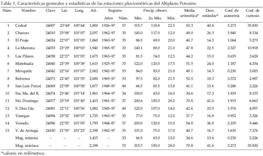 Corresponde a la disponible sobre precipitación máxima diaria anual (mm) en el sistema ERIC II (IMTA, 2000), para las estaciones pluviométricas del Altiplano Potosino o porción semiárida del estado de San Luis Potosí que pertenece a la Región Hidrológica No. 37 (El Salado), con más de 30 años de datos; con esta restricción se obtuvieron 15 registros, cuya localización geográfica se muestra en la figura 1; en la tabla 1 se presentan sus características generales y sus parámetros estadísticos insesgados (Campos, 2001).