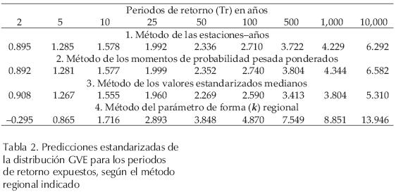 Al dividir cada dato de un registro entre su valor medio y conjuntar las 15 series del Altiplano Potosino (tabla 1) se obtuvieron 625 valores, cuyo ajuste de la distribución GVE con el método de los momentos L (Stedinger et al., 1993; Campos, 2001), condujo a las predicciones estandarizadas mostradas en la tabla 2.