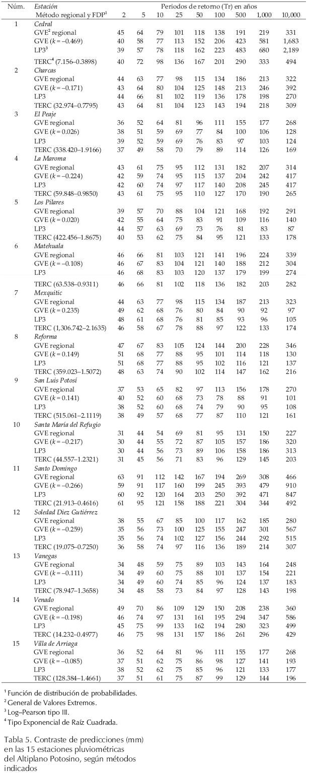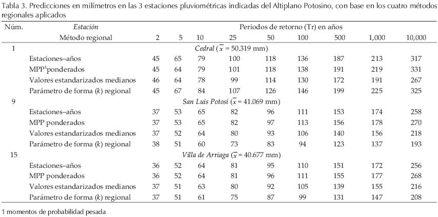 Por otra parte, un planteamiento simple y a la vez confiable para la selección de las predicciones regionales en cada estación pluviométrica, es adoptar las más grandes que fueron obtenidas. En las estaciones Cedral, Charcas, Santo Domingo, Soledad Diez Gtz. y Venado, el método del ajuste con parámetro de forma regional conduce a las mayores predicciones; en cambio, en el resto es el método del ajuste por momentos de probabilidad pesada ponderados.