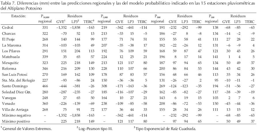 Los resultados de los ajustes de las distribuciones GVE, LP3 y TERC a los 15 registros procesados del Altiplano Potosino, se han concentrado en la tabla 5. El análisis de contraste cualitativo de estas predicciones y las del método regional adoptado, indica que en las estaciones pluviométricas en que existe presencia de valores dispersos, las distribuciones GVE y LP3 conducen a predicciones muy elevadas con respecto a las estimaciones regionales, no así el modelo TERC. Lo anterior es notable en Cedral, pero ocurre en todas las estaciones con coeficiente de asimetría cercano o superior a 2.0 (tablas 5 y 1). Por el contrario, en los registros que pueden ser considerados normales debido a que sus coeficientes de asimetría y curtosis se aproximan a cero y 3.0, respectivamente (tabla 1), como lo son Los Pilares, Mexquitic, Reforma y San Luis Potosí, todos los modelos subestiman las predicciones, pero de manera más severa las distribuciones GVE y LP3. En términos generales, la distribución TERC conduce a los resultados más aproximados a los regionales, según se aprecia cualitativamente de la tabla 5 y numéricamente a través de los residuos en la tabla 7.