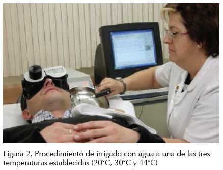 Esto se realiza básicamente con los siguientes pasos: se acuesta al paciente boca arriba y se procede a irrigar agua a una de las tres temperaturas establecidas (20°C, 30°C y 44°C), ya sea irrigando un oído o los dos (figura 2). Los volúmenes de agua establecidos son como mínimo de 200ml por un tiempo de 30 s, dejando un lapso de 5 minutos entre cada prueba. Después de haber irrigado el o los oídos, se observa un reflejo medible llamado Nistagmo, el cual se traduce en un movimiento involuntario de los ojos. Este patrón de movimientos nistágmicos es el que da la información al médico sobre posibles lesiones o trastornos internos del paciente a nivel del tallo cerebral (pacientes con coma o vértigo).