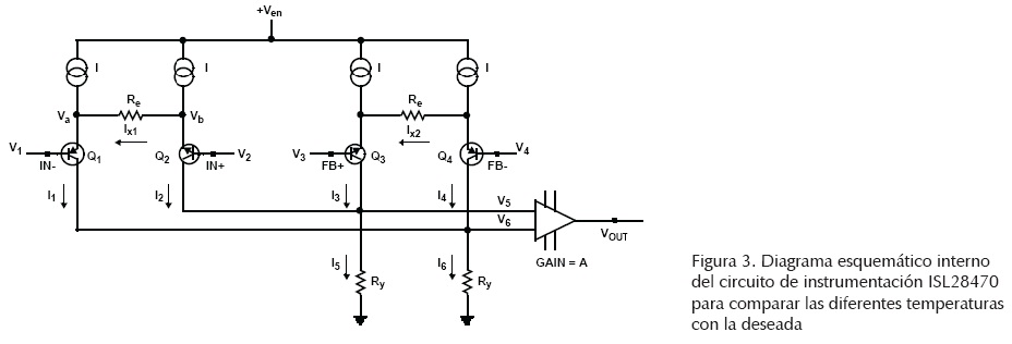 El circuito comparador utiliza el amplificador operacional (amp op) de instrumentación ISL28470 de la compañía Intersil (2007), el cual es un amp op cuádruple diseñado para funcionar si es alimentado por una sola fuente en un rango de 2.4V-5.5V y con una variación de voltaje de entrada y salida dentro del rango de la fuente de alimentación (Rail-to-Rail input and output, RRIO). Este amplificador operacional de instrumentación es especial para mediciones en aparatos médicos e instrumentación industrial, su constitución interna se compone de arquitectura bipolar, como se aprecia en la imagen de la figura 3.
