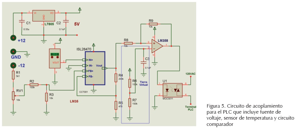 Entonces Vout = 0V por RRIO. Con este potencial de salida la resistencia de calefacción se encuentra en estado apagado, por lo que es necesario el efecto contrario, esto se logra invirtiendo la señal, lo cual se realiza con el LM358 y el MOC3011(figura 5).