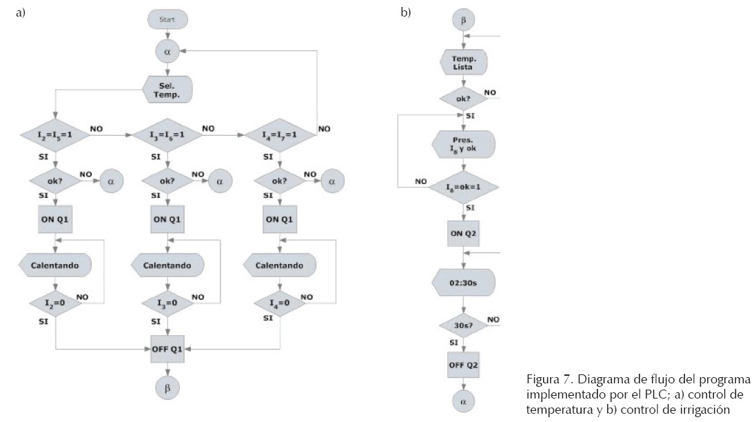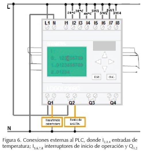 Como se mostró en la sección anterior, la figura 5 sirve de transductor con entrada a la temperatura real del agua y con salida a una señal de corriente alterna. Esto por la necesidad de interacción con el PLC (Manual Logo, 2003) (figura 6). El diseño se basa en realizar tres circuitos como el mostrado en la figura 5, cada uno compara de manera independiente la temperatura de 20°C, 30°C y 44°C, los circuitos se conectan en las terminales I2, I3 y I4 del PLC, respectivamente; asimismo, se tienen conectadas las entradas I5 a un interruptor SW1, I6 a SW2, I7 a SW3 e I8 a SW4, que son las señales para activar las temperaturas de 20°C, 30°C, 44°C y el botón de inicio de irrigación, respectivamente. El PLC contiene dos programas internos específicos para controlar dos salidas conectadas a una resistencia calefactora Q1 (la cual calienta el agua) y una bomba de succión Q2 (que succiona y entrega agua a presión regulable por 30 segundos), vea la parte inferior de la figura 6. Estos programas se muestran en las figuras 7a y 7b, que son el control de la temperatura y el inicio de irrigación. El aparto cuenta con una sonda de polietileno desechable para uso individual (se puede implementar una sonda semejante al otoscopio si así se requiere) y cuenta con manguerillas de HMW-HDPE (polientileno de alto impacto).