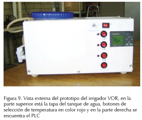Se realizó la instrumentación de un irrigador para prueba VOR (vestíbulo ocular reflex), con el uso de un PLC LOGO!230RC como etapa de potencia y decisión, asimismo un circuito electrónico auxiliar para el proceso de sensado de la temperatura. El irrigador (figura 9) permite la automatización de un proceso necesario en el diagnóstico de desórdenes en el equilibrio o, en el peor de los casos, para diagnosticar lesión en el tallo cerebral de pacientes en coma.