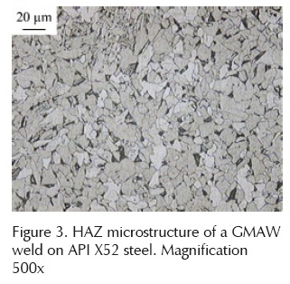 As shown in Figure 1, the welding metal shows the acicular ferrite columnar grains found in common carbon steel welds. HAZ is composed of refined grains of ferrite-pearlite (Figure 2), product of the transformation of base metal with the heat provided by the welding process. The base metal consists of equiaxed grains of ferrite-pearlite, typical in all carbon steels (Figure 3).