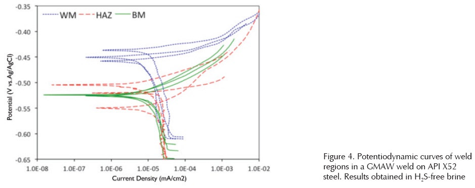 When a GMAW weld on X52 steel is subjected to electrochemical corrosion attack by H2S, the base metal shows the higher corrosion rate and the most cathodic corrosion potential of weld regions. The weld metal and HAZ are more resistant to electrochemical corrosion by H2S than the rest of the steel pipe. The HAZ presents no special susceptibility to electrochemical corrosion by H2S, the latter having an intermediate value between the base metal and weld metal. Weld regions showed higher corrosion rates in the presence of H2S. However, their Ecorr values were more anodic in the H2S-free brine, which means they are more susceptible to corrosion in this environment.