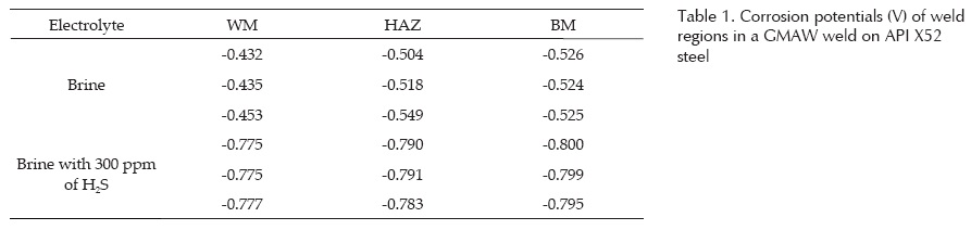 Table 2 shows the results of LPR for the weld regions in the presence of 300 ppm of H2S. The HAZ presents the lowest CR. All the weld regions presented lower CRs in H2S-containing solution than in the brine. These results are consistent with the findings of Galvan et al, 2003).