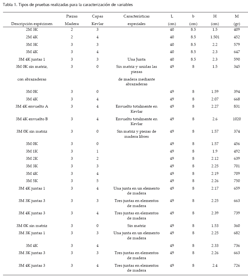 • Número de capas de madera y de Kevlar: conformación de especímenes variando la cantidad de capas de madera y de Kevlar