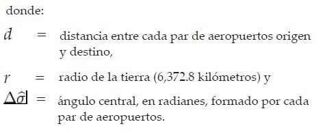 Para estimar la distancia de estos trayectos se calculó la distancia ortodrómica entre cada par de aeropuertos considerados. Mediante el procesamiento de las bases de datos de la Dirección General de Aeronáutica Civil (DGAC), para el año 2012, se determinó que 67 aeropuertos mexicanos tuvieron operaciones aéreas y se detectaron 873 rutas aéreas (432 nacionales y 441 internacionales). Con objeto de calcular las distancias ortodrómicas entre cada par de aeropuertos se utilizaron las siguientes ecuaciones: