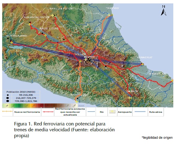 Se debe observar cómo en el caso de la red para trenes de media velocidad se ocupa en buena medida infraestructura existente, excepto en la ruta Toluca-Acapulco y gran parte de la ruta México-Tampico, que es infraestructura nueva. Por su parte, en la red ferroviaria de alta velocidad, toda la infraestructura es nueva debido a que se requiere un trazo más recto y con mayores especificaciones técnicas. En las figuras se presentan además del trazo preliminar de la red ferroviaria existente y/o nueva, la concentración de población, los ríos, las elevaciones y las rutas aéreas asociadas. Se observa cómo los trazos preliminares de las rutas ferroviarias de media y alta velocidad tienen relación con las concentraciones de población. La capa de información georreferenciada de la población para el año 2010, se obtuvo del Instituto Nacional de Estadística y Geografía (INEGI, http://www.inegi.org.mx/).