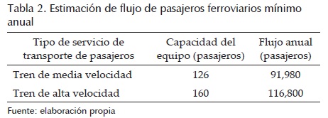 De acuerdo con las capacidades de los equipos ferroviarios seleccionados en el inciso anterior y considerando que operan los 365 días del año, con al menos un viaje en cada sentido (viaje redondo), en la tabla 2 se muestra la estimación de los flujos anuales mínimos de pasajeros para los trenes de media y alta velocidad.