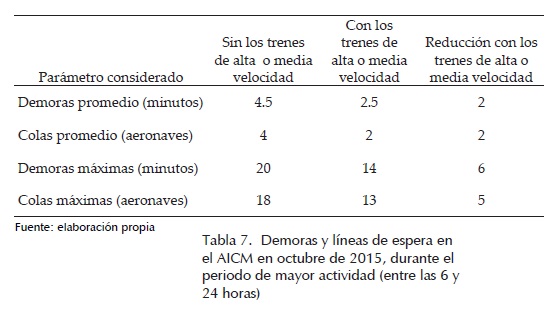 Por último, con base en un modelo de simulación del AICM (Herrera, 2012) se estimó que al implementar el servicio de trenes de media o alta velocidad, habría una mejora en el servicio de este aeropuerto, dado que habría una disminución en las demoras y líneas de espera en las pistas. Los resultados para octubre de 2015 se presentan en la tabla 7.