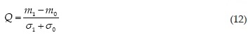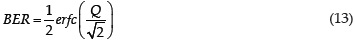 Donde mi y σi representan la potencia media y desviación típica de potencia respectivamente del bit i en el instante de decisión en el receptor. La tasa de error de bit (BER) definida en función de Q está dada por (Freude et al., 2012)