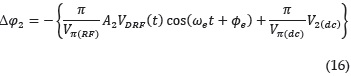 El término ε en (2) representa la diferencia entre los coeficientes de acoplo de propagación de energía de la rama superior e inferior. Para un modulador MZ ideal, ε=0, lo cual indica que la potencia se divide en partes iguales en las dos ramas. A su vez, los términos de variación de fase Δφ dependen de la tensión de polarización V(dc) , este valor se define como aquella tensión que aplicada sobre los electrodos del dispositivo provoca un cambio de fase de 180° sobre la señal óptica que se propaga por la guía de onda como consecuencia del efecto electroóptico. Del mismo modo depende de VRF, el cual representa el voltaje necesario en las entradas de RF (superior e inferior) para provocar un cambio de fase de 180° entre los dos brazos del interferómetro. Si se asume un coeficiente de acoplo A1= A2 = 0.5, y α = 2 (para unas pérdidas de inserción típicas de un modulador MZ de 6 dB), la ecuación (1) se puede expresar como