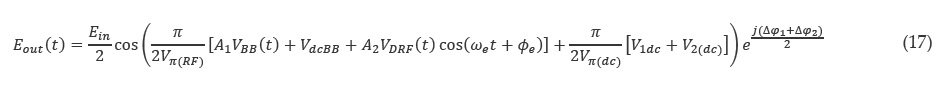 Puesto que el campo de entrada del segundo modulador corresponde al campo de salida del primer modulador, se obtiene la expresión de campo eléctrico en función de los índices de modulación de las señales de banda base y radiofrecuencia.