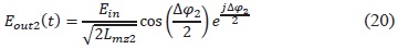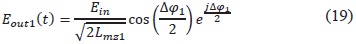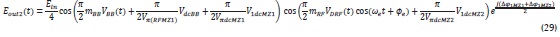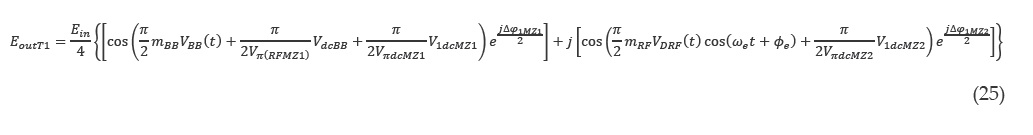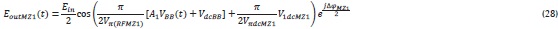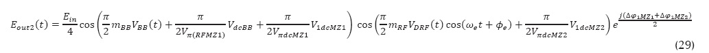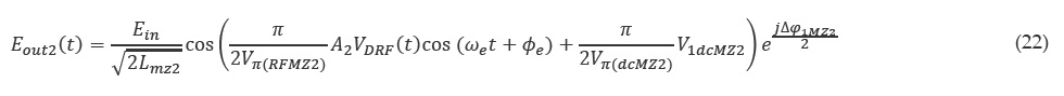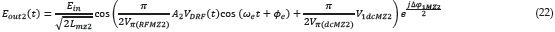 Donde Lmz son las pérdidas del modulador. Puesto que la señal de banda base y radiofrecuencia se modulan de manera independiente en cada modulador MZ, los campos de salida quedan definidos con las ecuaciones 21 y 22.