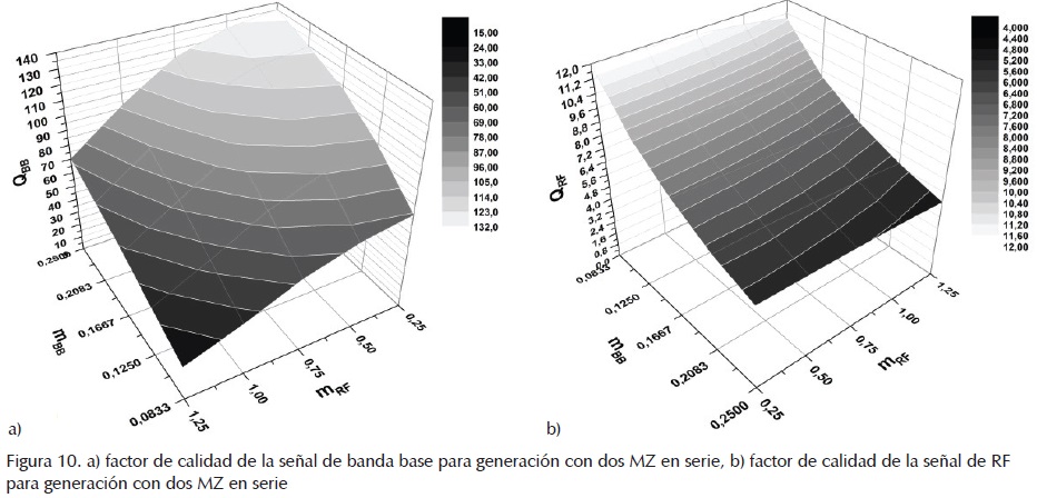 Los resultados obtenidos para el presente esquema se muestran en las figuras 10 y 11 . Los resultados se basan en variaciones de índices de modulación de la señal de banda base entre 0.0833 y 0.25, y de índices de modulación de radiofrecuencia con cambios iguales a los esquemas anteriores. Se selecciona un nivel de polarización de banda base de 1.25 V sobre el cual se ubica la señal. Los valores pequeños de índice de modulación de banda base reducen los problemas generados por la submodulación presente al combinar las señales de radiofrecuencia y banda base, nótese el doble coseno de la función de campo. Este aspecto impide recuperar adecuadamente la señal de radiofrecuencia. Como se puede observar en la figura 10a, el esquema de generación con dos moduladores MZ en serie ofrece buenos factores de calidad para la señal en banda base usando cualquier combinación de índices de modulación de RF y banda base. Se observa una tendencia monótona creciente con mBB y monótona decreciente con mRF en donde en el peor caso se consigue un factor de calidad Q de 15, es decir, un BER de 1.8x10-51.