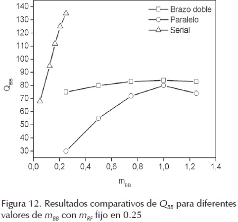 Con el fin de identificar el comportamiento general de los sistemas propuestos, las figuras 12 y 13 muestran una comparación de resultados en donde se reflejan los valores más altos del factor de calidad para la señal de banda base y para la señal de radiofrecuencia. Para el caso de la señal de banda base, la figura 12 muestra el factor de calidad Q de dicha señal en función de mBB para un mRF fijo en 0.25. Se observa en general, que el comportamiento del factor de calidad es monótono creciente con el valor del índice de modulación, como se observó anteriormente. Sin embargo, nótese como para mBB < 1 el esquema de generación de brazo doble mantiene valores casi constantes de QBB si se compara con los valores obtenidos para el esquema de generación en paralelo. Este comportamiento se debe principalmente a la penalización en potencia que impone la combinación mediante el acoplador óptico, que afecta la relación de extinción de la señal de banda base para bajos valores de mBB. Por otro lado, se observa que en el rango de mBB analizado para la generación serial, el comportamiento es creciente y la curva presenta una pendiente mayor que la obtenida con los otros esquemas, lo cual se debe a la independencia de uso del rango dinámico del modulador MZ.