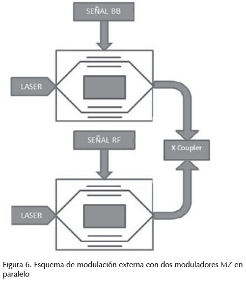 En este esquema la señal de banda base y radio frecuencia se introducen al modulador Mach Zehnder por sus brazos superior e inferior, respectivamente. La figura 3 muestra la configuración para dicho sistema.