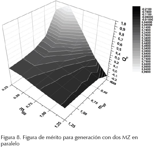 La determinación del punto adecuado de trabajo se consigue a través de la figura de mérito, la cual representa el producto punto a punto de las figuras 4 y 5 . El resultado normalizado que se consigue se muestra en la figura 5, donde se observa que el punto óptimo de trabajo se obtiene para la combinación de los índices de modulación mBB= 0.25 y mRF = 0.25. Para valores de mBB entre 0.25 y 0.75 y mRF entre 0.25 y 0.5 se encuentran rangos de configuración en los cuales se consiguen factores de calidad Q para señales de RF y banda base mayores o iguales a 6, área más clara de la figura 6, determinando los posibles puntos de operación del sistema en el cual se generan señales de banda base y RF con buena calidad. Fuera de este rango la recuperación de las señales es deficiente presentando factores de calidad Q inferiores a 6.