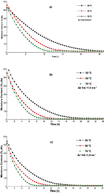 Figure 2 shows drying effect in moisture content at different combinations of drying air temperature with constant air velocity. Final moisture content under different conditions resulted to be bounded from 8.54% to 15.53% (db.). By comparing Figures 2a, 2b and 2c it can be seen that minimum final moisture content depends, to certain extent, on higher drying rate and hotter temperatures. Moreover, it can be noticed, for each applied temperature, that the higher the air velocity is, so the initial rate is. Figure 3 shows the existent relationship between moisture content reductions with the applied air flow in the range of 0.5 ms-1 to 1.5 ms-1. By comparing Figures 3a, 3b and 3c it can be observed that the greater air flows are, the rate of pineapple drying increases. Thus, from 50 to 70°C at 0.5 ms-1 drying time decreased from 26 to 12 hours; similarly with higher air flow rates, from 50 to 70°C at 1.0 ms-1 drying time decreased from 20 to 10 hours and from 50 to 70°C at 1.5 ms-1 drying time decreased from 16 to 8 hours.