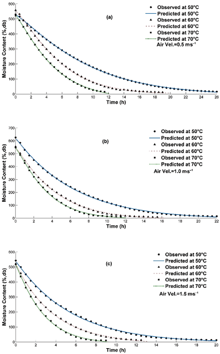 Figure 4 Predicted and observed moisture content of pineapple using Hasibuan and Daud model for a) T= 50, 60 and 70°C and air velocity 0.5 ms-1, b) T= 50, 60 and 70°C and air velocity 1.0 ms-1 and c) T= 50, 60 and 70°C and air velocity 1.5 ms-1