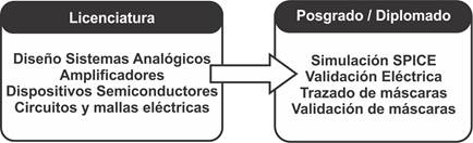 La Figura 1 muestra las materias más importantes para que un estudiante de posgrado egrese con los conocimientos necesarios para el diseño de CIs digitales. De manera similar, la Figura 2 muestra las materias más importantes para que el alumno egrese de la maestría con la capacidad de diseñar CIs de procesamiento analógico. Al combinar ambos conocimientos, el alumno egresará con la capacidad de diseñar CIs de procesamiento de señal mezclada.
