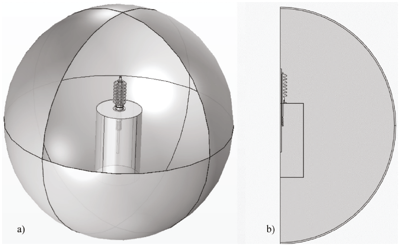 Para la realización de las simulaciones, tanto para el modelo en Axisimétrico-2D, como para el 3D, se asume una superficie esférica sólida de 80 pulgadas de radio, con una capa de 0.2 pulgadas, que envuelve toda la geometría de la boquilla. El interior de esta esfera representa la región de aire que hace contacto con los diferentes dispositivos que conforman el transformador. A la capa externa se le agrega la condición de frontera de dominio de elementos infinitos, como se observa en la Figura 6, concepto que simula que un espacio infinito alrededor de nuestro objeto sea infinito, para ello, hace que los campos que llegan a esta capa no reboten y sean totalmente absorbidos, simulando que el campo o la onda sigue propagándose (Illias et al., 2010).