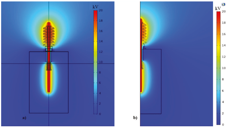 La Figura 8 muestra la distribución del potencial eléctrico en ambos modelos, en escala de colores en lugar de líneas equipotenciales, para una mejor visualización. Se nota como el conductor central se encuentra en color rojo intenso, a 19.9185 kV, indicando el máximo valor de potencial, esto representa la conducción de la barra central, como se definió anteriormente. Se observa la distribución del potencial en todo el espacio y materiales, en función de la geometría y la permitividad relativa de cada material. Se obtiene el mismo comportamiento para el modelado 3D y Axisimétrico-2D.