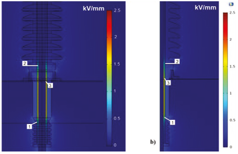 El máximo valor de campo eléctrico obtenido, zona 3, es de aproximadamente 2 kV/mm, en la región del aceite que pega a la barra, cerca de la brida de montaje que funciona como aterramiento de la boquilla. Se observa que este material es el más afectado, por ende, es el que mayor esfuerzo eléctrico soporta. Esto debido a que, en la construcción de la boquilla, el aceite es el material que menor permitividad eléctrica posee (ε = 2.3), entonces el esfuerzo eléctrico incrementa de manera inversa al valor de permitividad