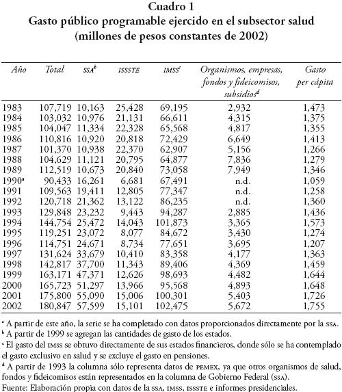 Durante los casi 20 años que contempla el periodo de estudio, la población mexicana aumentó en más de 25 millones, que aunado a la errática y pobre trayectoria del gasto en salud, dieron como resultado la acumulación de rezagos en materia de salud pública. Ello se confirma en el hecho de que, si bien aumentó el gasto en salud en 67.9% en términos reales en el periodo 19832002, el gasto per cápita sólo lo hizo en 19.10% (cuadro 1).
