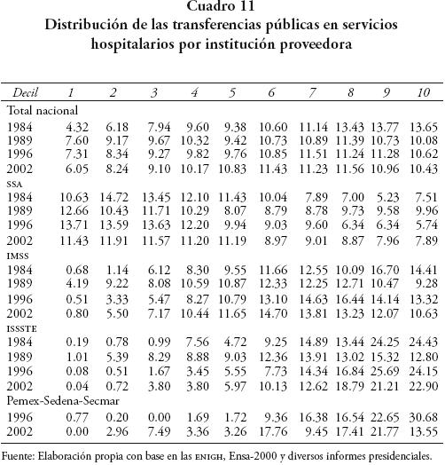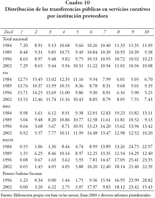 En cuanto al tipo de atención médica, la preventiva y la curativa muestran un cambio a favor de los ingresos intermedios, en claro detrimento tanto del primer como del último decil, con el agravante de que 10% de las familias más pobres no llega a recibir en ninguno de los dos casos el 1% de las trasferencias. En cuanto a los servicios hospitalarios, ha habido una evolución favorable hacia el primer 50% de la población, aunque con un beneficio sólo marginal al primer decil. En suma, aunque hoy las transferencias son más homogéneas que nunca, son las clases medias las más beneficiadas, puesto que han ganado mayor presencia.
